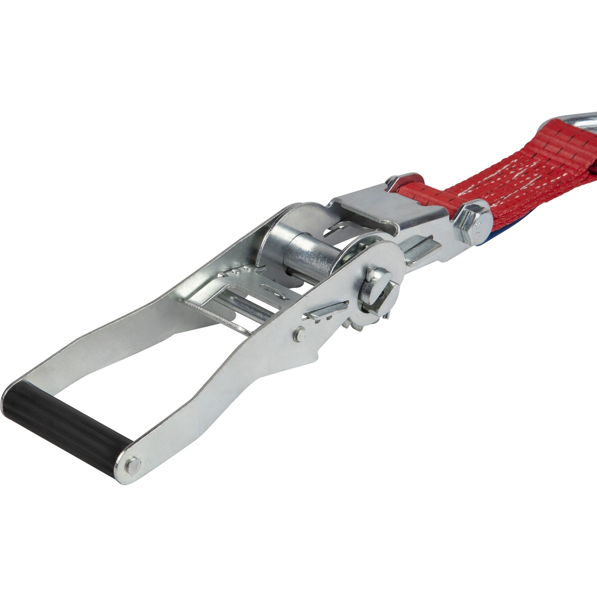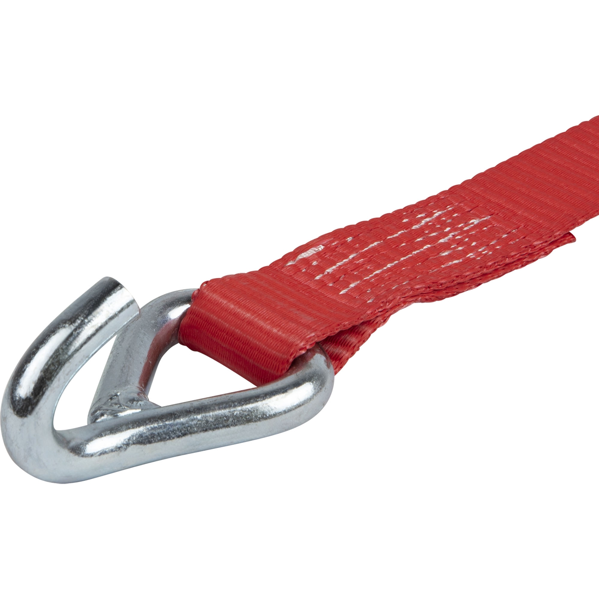 Radsicherung, 3-teilig verwendbar für Lochreling Bandbreite 35 mm LC 1500 daN Farbe rot besteht aus 1 x Druckratsche mit kurzem Festende (Länge 110 mm) und Triangelspitzhaken 1 x Zurrgurtband mit Triangelspitzhaken, Länge 3000 mm 1 x Verbindungsgurt mit Endschlaufe, Länge 370 mm