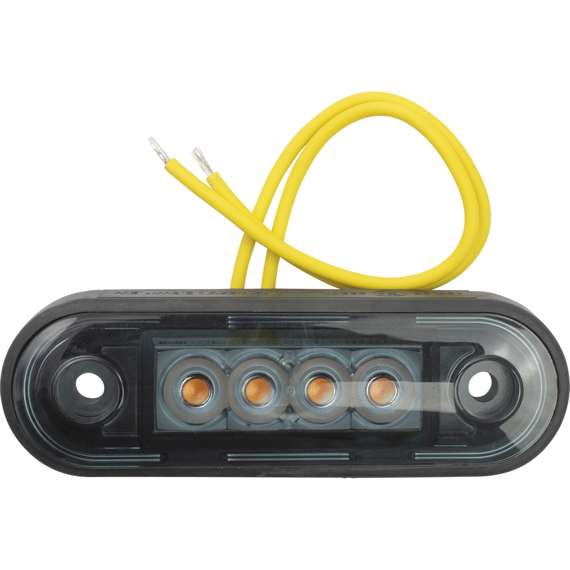 Seitenmarkierungsleuchte LED DARK Version Farbe gelb Breite 84,2 mm Höhe 27,7 mm Tiefe 12,8 mm Lochabstand 58 mm Spannungsbereich 12 – 36 V Anschluss Kabel 150 mm